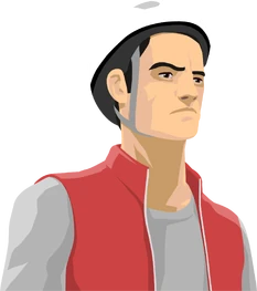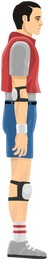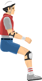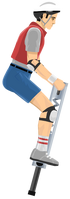 Pogostick Man wears a white helmet, similar to Segway Guy, Irresponsible Dad, and Irresponsible Mom; he further sports elbow and knee pads. He also wears a gray shirt with a red vest over it, blue shorts with a black belt, a white wrist band, gray and black shoes with white laces, and white socks with two red stripes. His pogo stick is the smallest, thinnest vehicle in the game, and can break into four different pieces: top part of the frame, bottom part of frame, stick, and spring.
